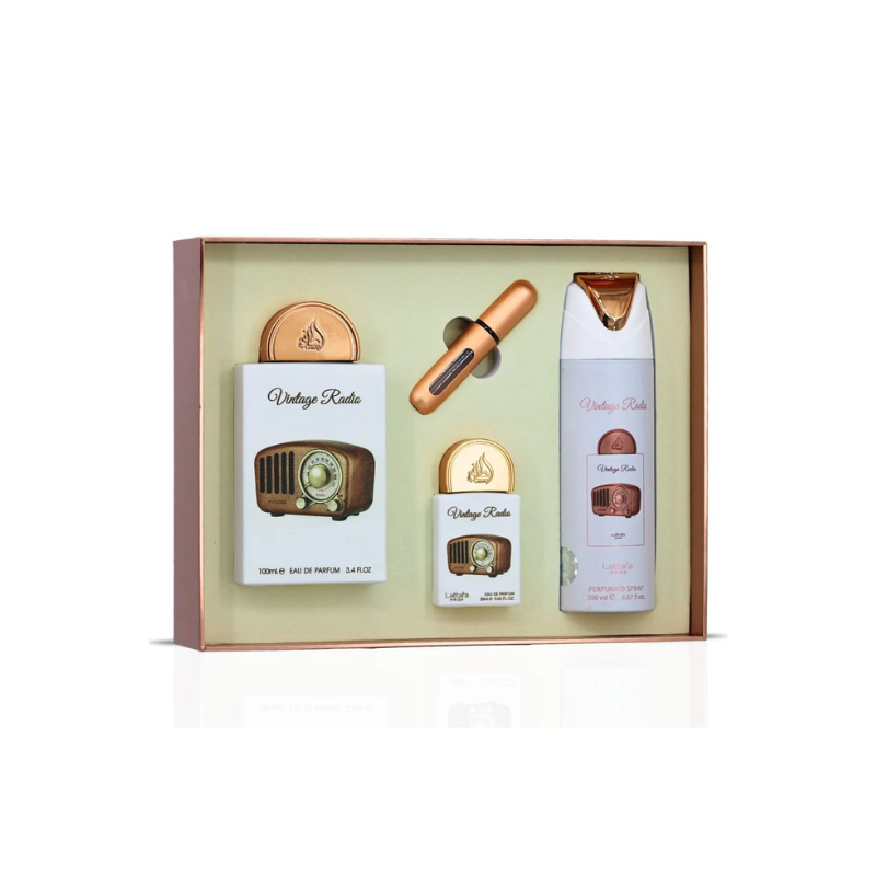 El Set de Perfumes Lattafa Vintage Radio es una fragancia masculina que evoca la elegancia clásica y el encanto atemporal de los verdaderos caballeros. Inspirado en el diseño nostálgico de una radio vintage, este set combina tradición y modernidad para crear una experiencia olfativa inigualable.